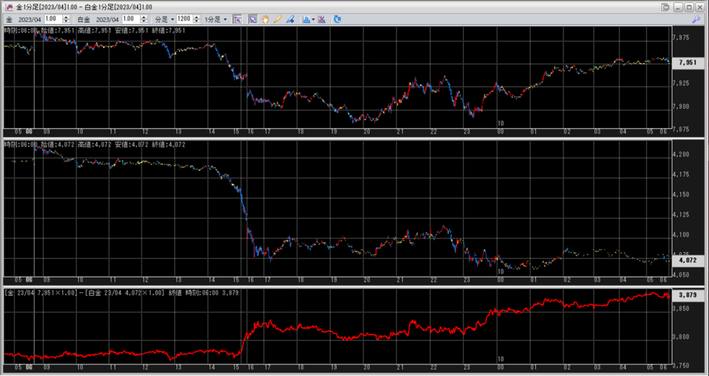 現在、金白金鞘拡大の仕掛け金買い1枚-白金売り2枚を2組、保持しており、