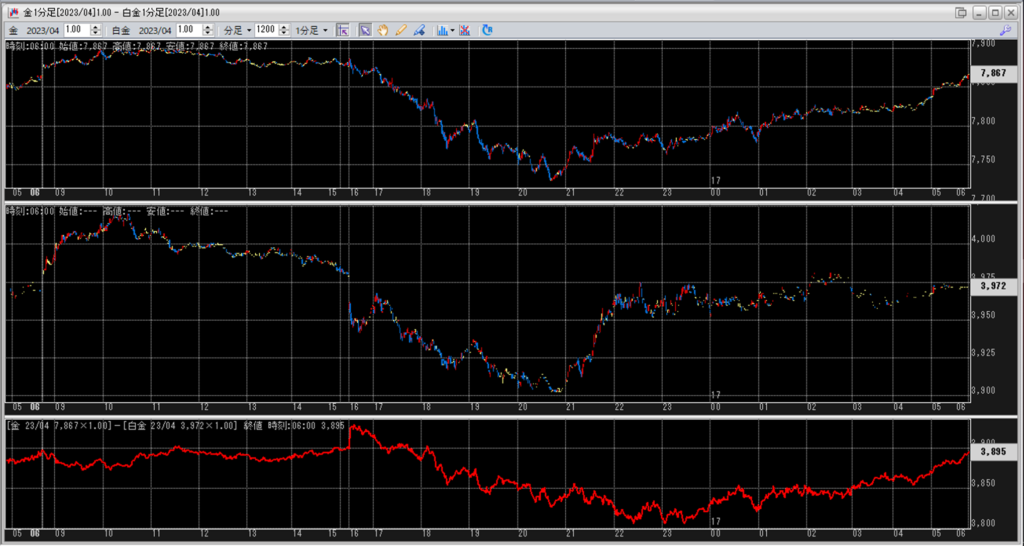 変わらず、鞘拡大の仕掛け金買い1枚-白金売り2枚を保持していこうと思います。