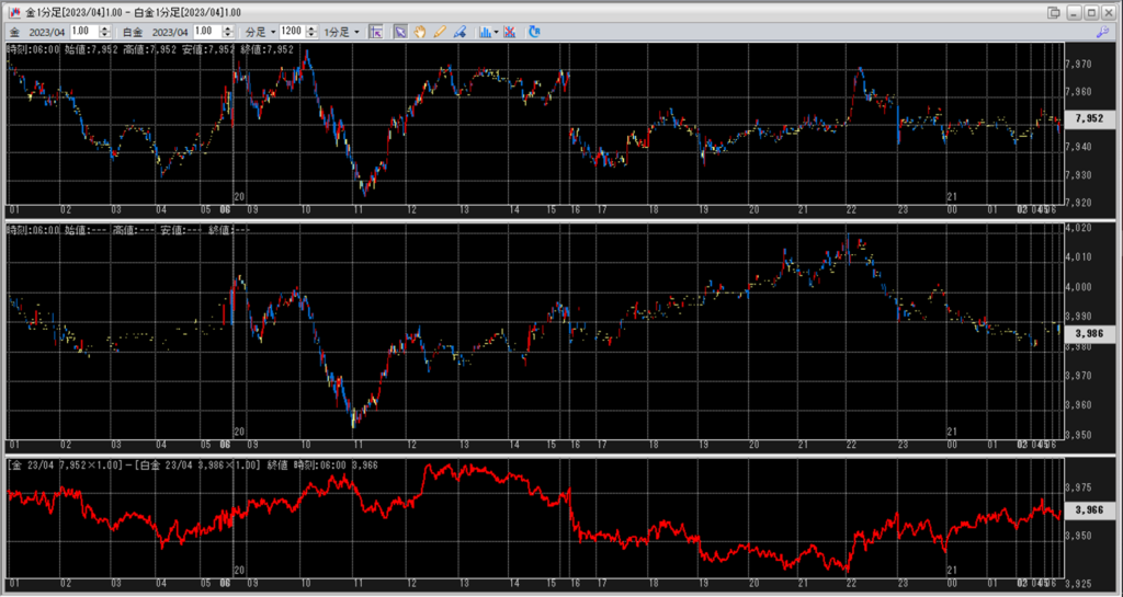 変わらず、鞘拡大の仕掛け金買い1枚-白金売り2枚を保持していこうと思います。