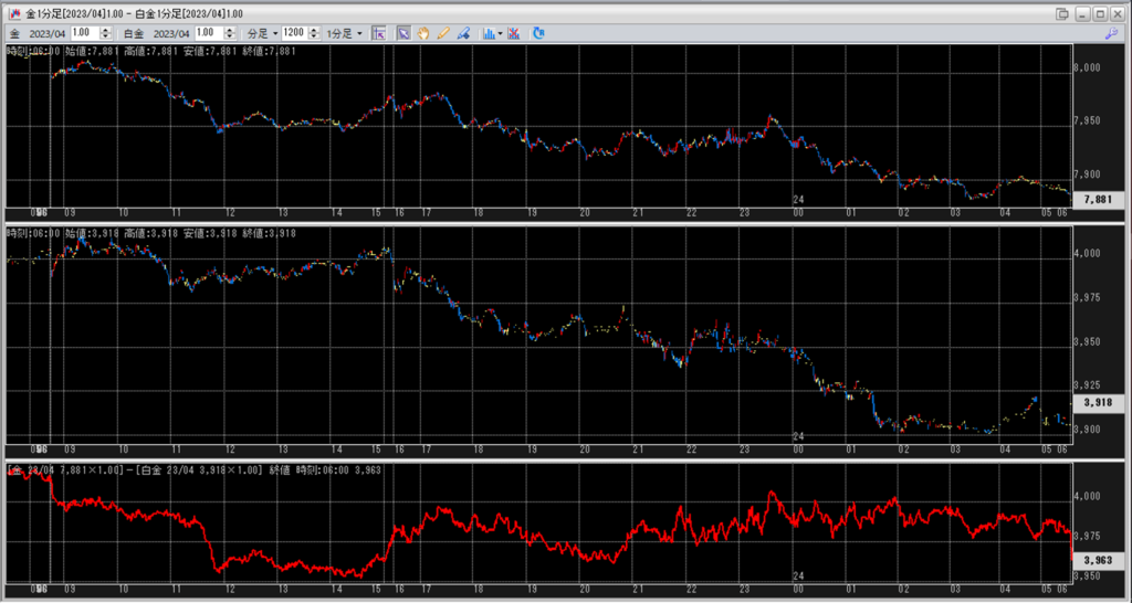 変わらず、鞘拡大の仕掛け金買い1枚-白金売り2枚を保持していこうと思います。