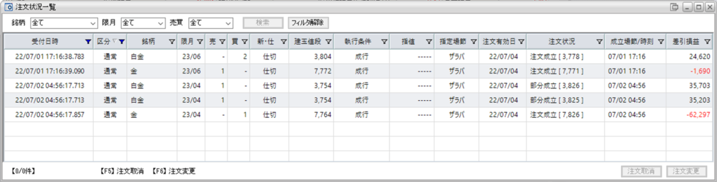 鞘拡大の仕掛け金買い1枚-白金売り2枚を仕掛け、利確することが出来ました。