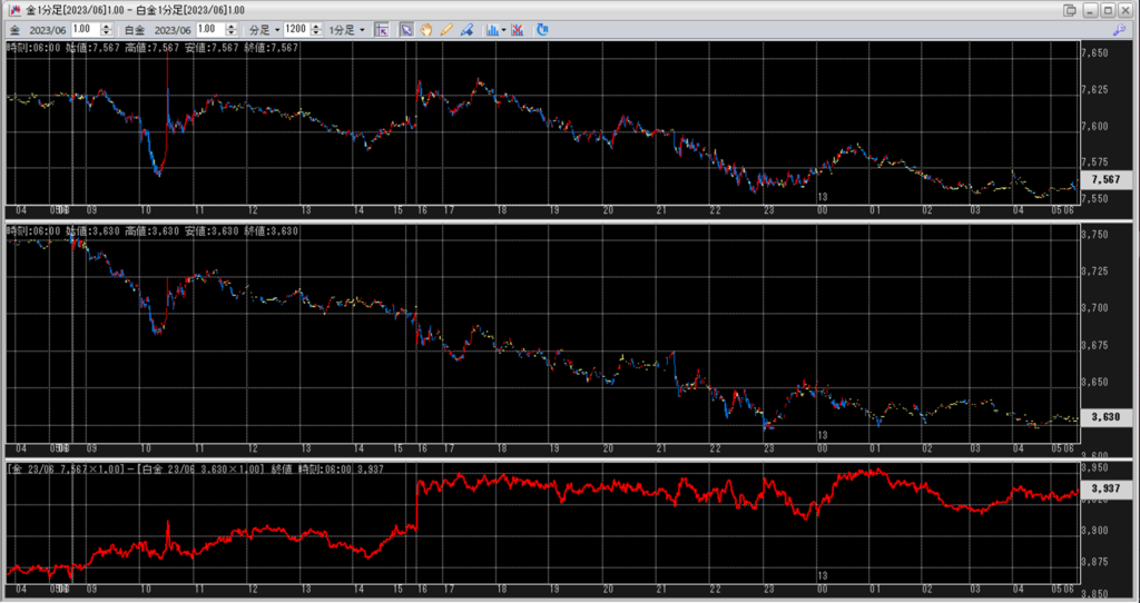 そして、鞘拡大の仕掛け金買い1枚-白金売り2枚を建てると思います。