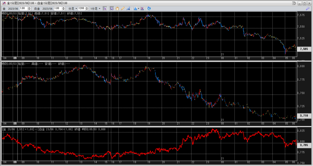 いつ、鞘拡大の仕掛け金買い1枚-白金売り2枚を損切りしていくかを