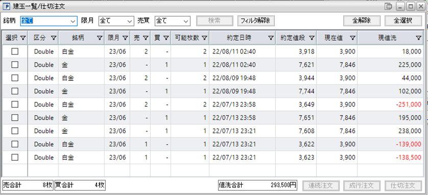 現在、鞘拡大の仕掛金買い1枚-白金売り2枚を4組を保持しています。