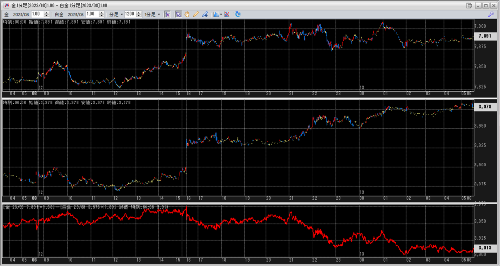下:金白金鞘(金白金の価格差 = 金1グラムの価格 - 白金1グラムの価格)