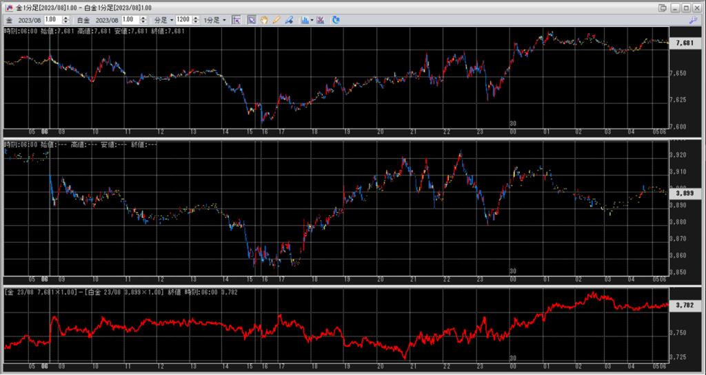現在、鞘拡大の仕掛け金買い1枚-白金売り2枚を2組、保持しています。
