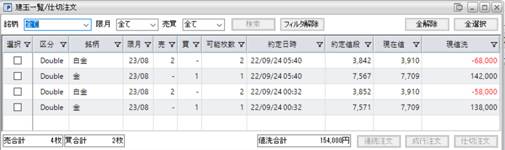 現在、鞘拡大の仕掛け金買い1枚-白金売り2枚を2組、保持しています。