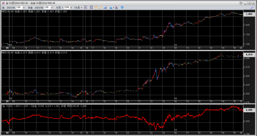 現在、鞘拡大の仕掛け金買い1枚-白金売り2枚を2組、保持しています。