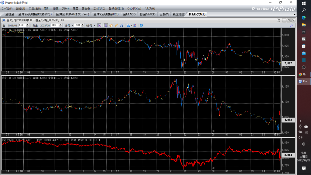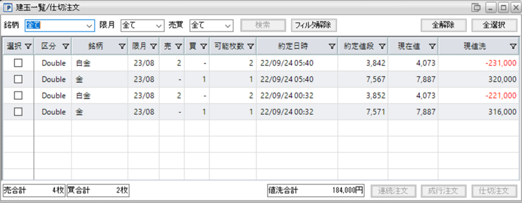 現在、鞘拡大の仕掛け金買い1枚-白金売り2枚を2組、保持しています。