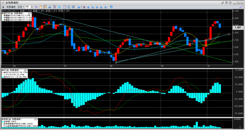 移動平均線の一番上に位置している短期線7,806円を超えて、
