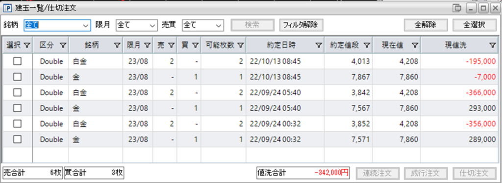 現在、鞘拡大の仕掛け金買い1枚-白金売り2枚を3組、保持しています。