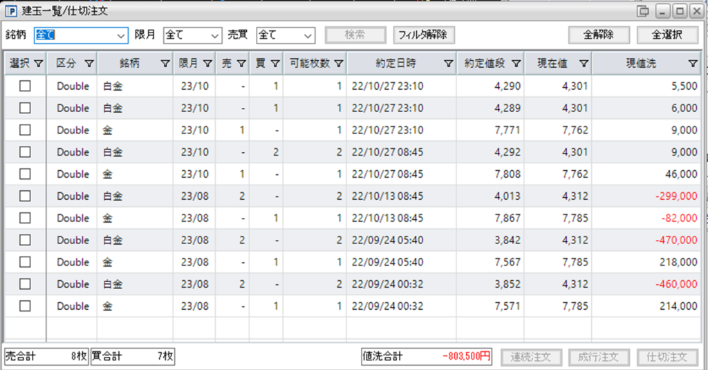 鞘縮小の仕掛け金売り1枚-白金買い2枚を2組も保持しています。