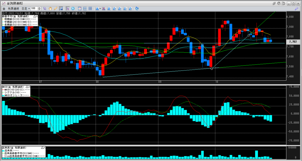 移動平均線の真ん中に位置している中期線7,799円を割り込んで、