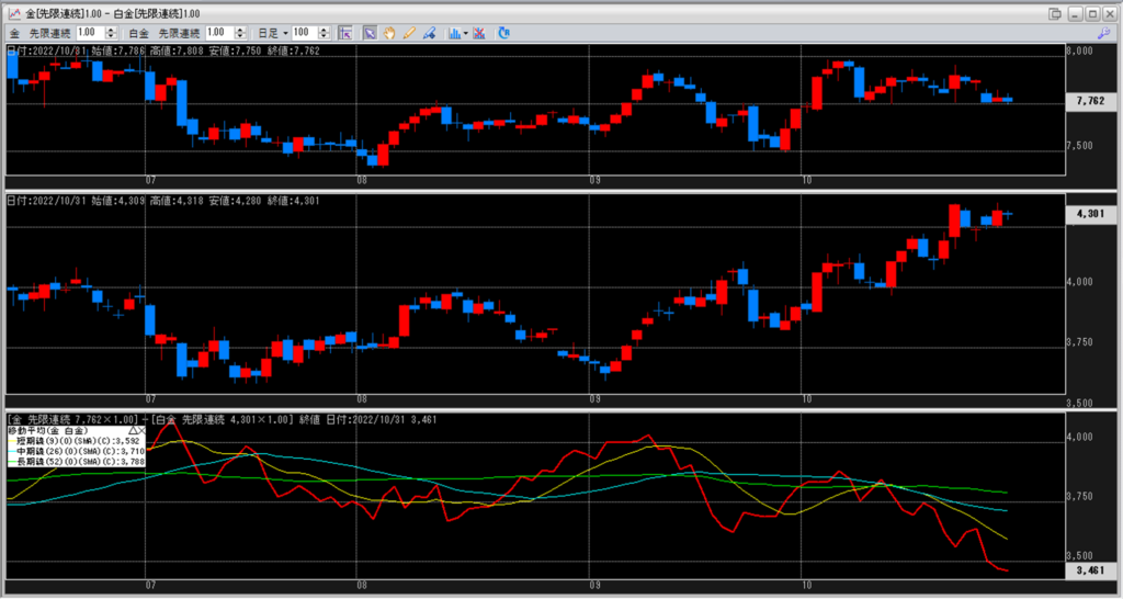 下記に金白金鞘の移動平均線のチャートを貼り付けています。