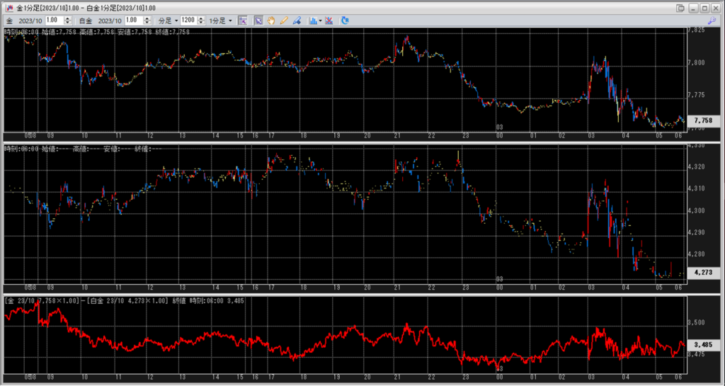 そんな中で鞘縮小の仕掛け金売り1枚-白金買い2枚を仕切り、