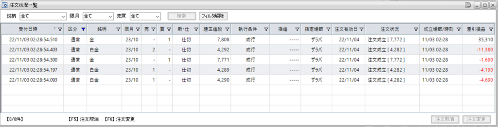 鞘拡大の仕掛金買い1枚-白金売り2枚を追加するとは、我ながら何を考えているのやら。