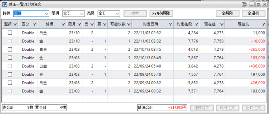 現在、鞘拡大の仕掛け金買い1枚-白金売り2枚を4組、保持しています。