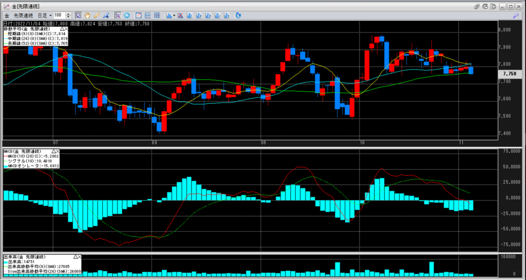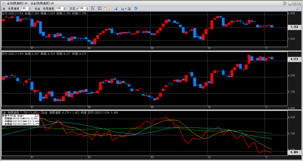 下記に金白金鞘の移動平均線のチャートを貼り付けています。