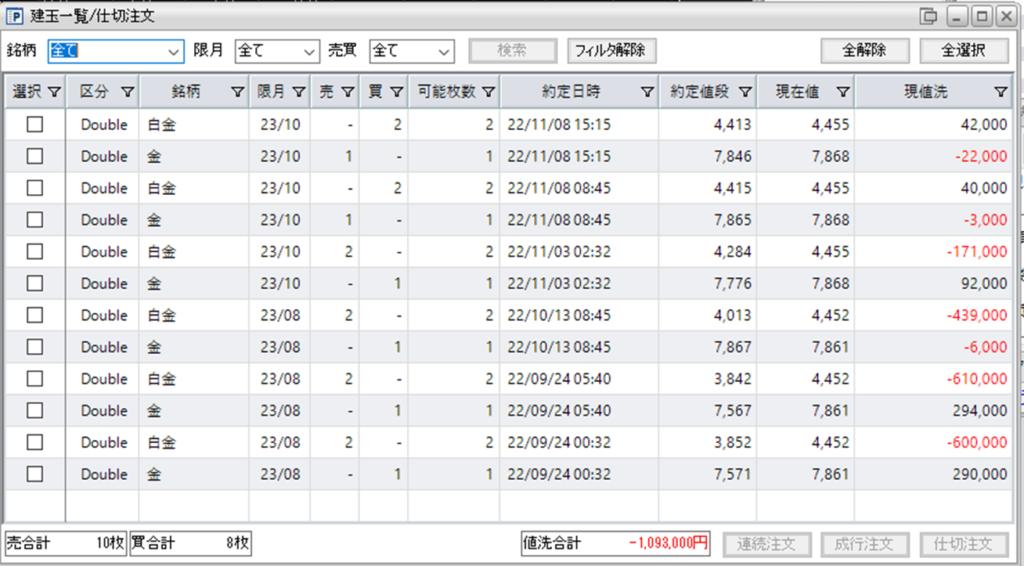 現在、鞘拡大の仕掛け金買い1枚-白金売り2枚を4組と