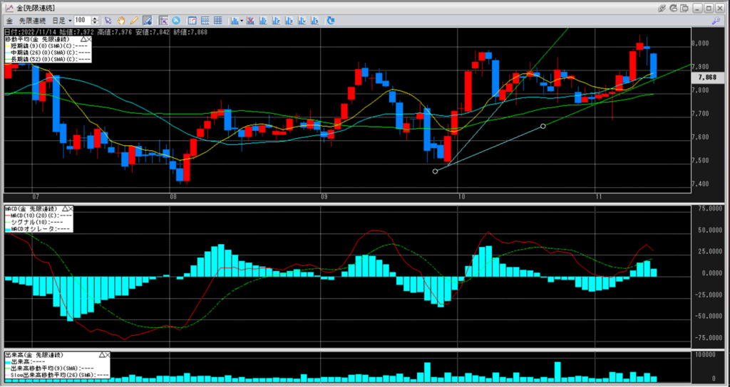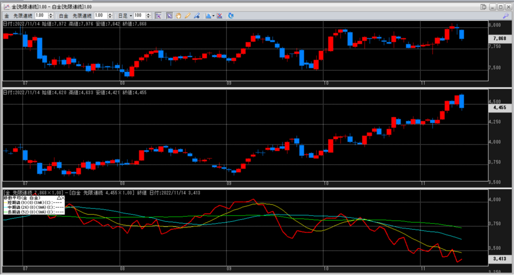 下記に金白金鞘の移動平均線のチャートを貼り付けています。