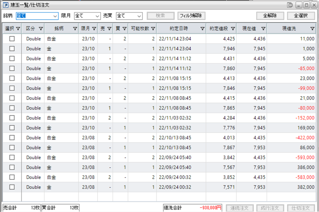 ですが、鞘縮小の仕掛け金売り1枚-白金買い2枚は、ほとんどが含み損になっています。