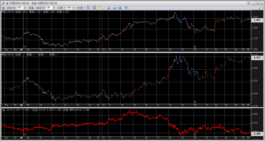 現在、鞘拡大の仕掛け金買い1枚-白金売り2枚の4組を保持しています。