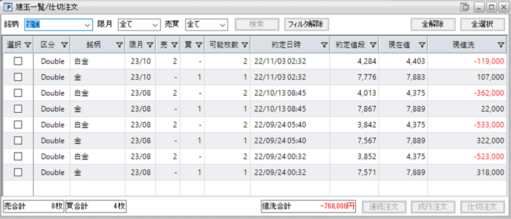 現在、鞘拡大の仕掛け金買い1枚-白金売り2枚の4組を保持しています。