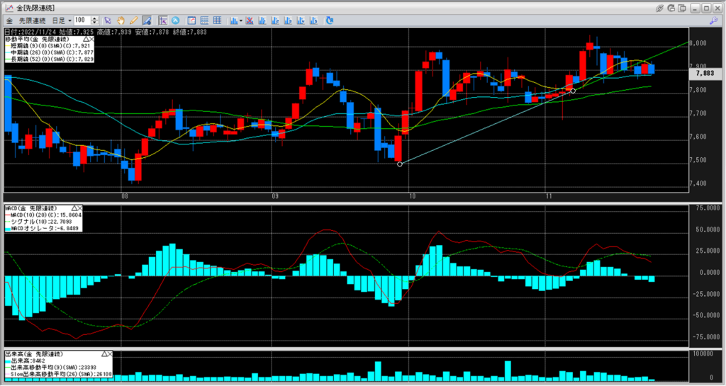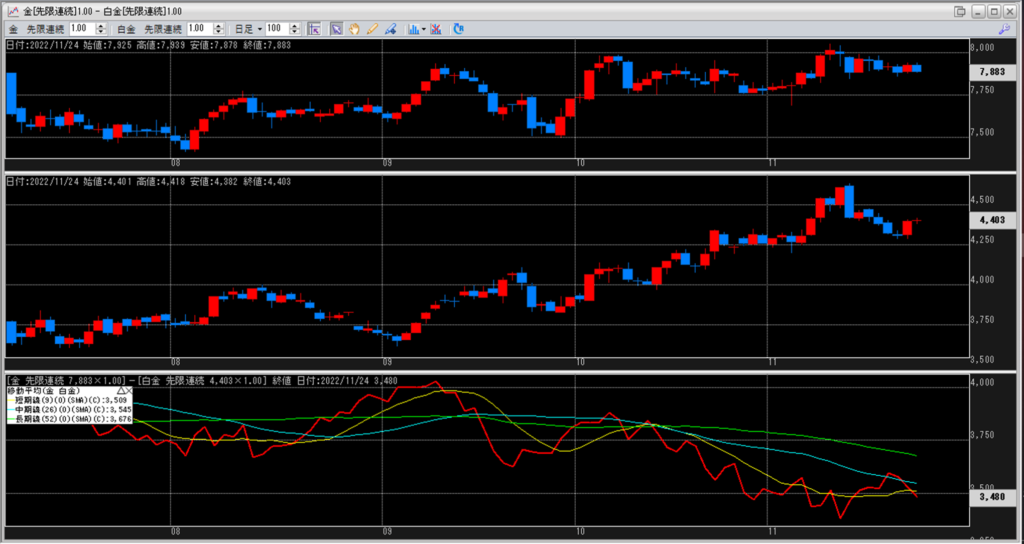 下記に金白金鞘の移動平均線のチャートを貼り付けています。