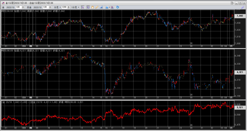 現在、鞘拡大の仕掛け金買い1枚-白金売り2枚の4組を保持しています。