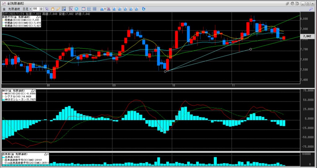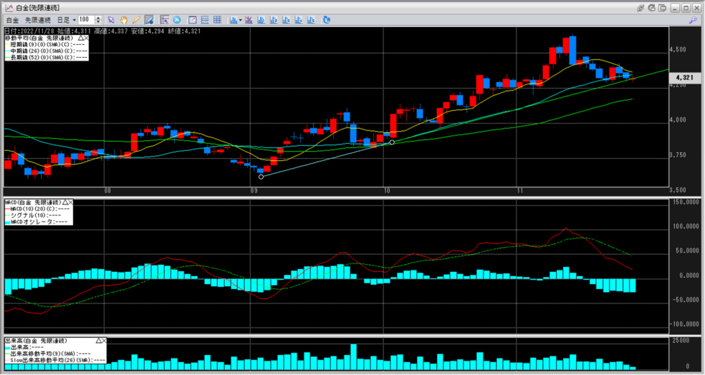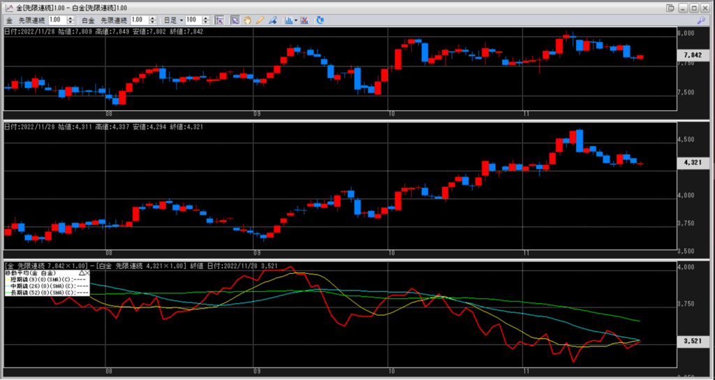 下記に金白金鞘の移動平均線のチャートを貼り付けています。