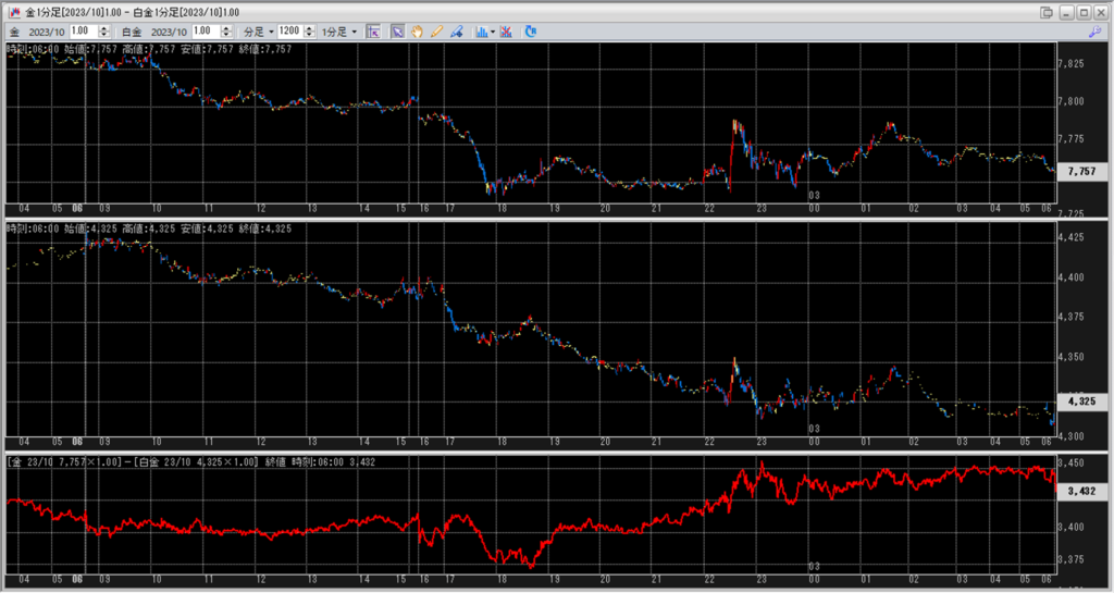 昨日の時点で思い切って、鞘拡大の仕掛金買い1枚-白金売り2枚を増やしていくのが