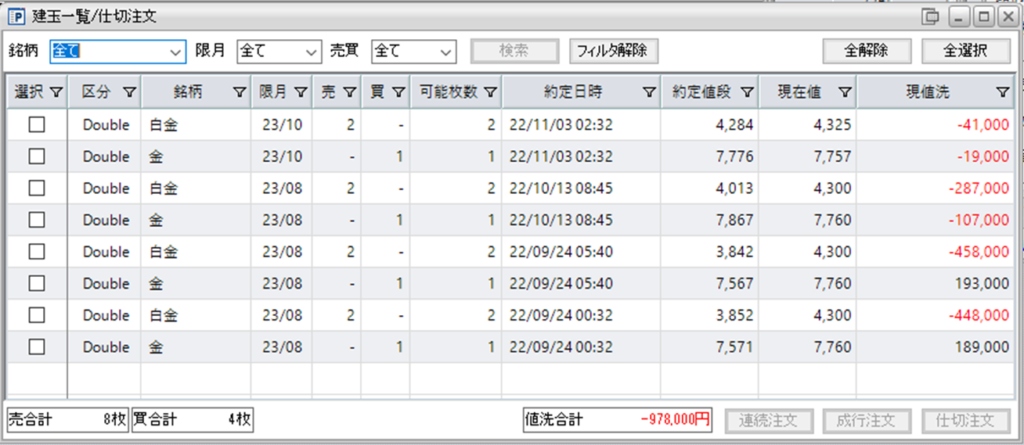 現在、鞘拡大の仕掛け金買い1枚-白金売り2枚の4組を保持しています。