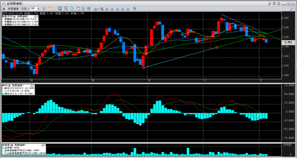 移動平均線の一番下に位置している短期線7,811円を割り込んで