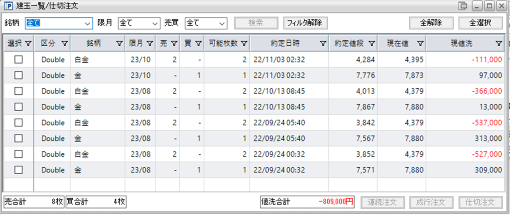 現在、鞘拡大の仕掛け金買い1枚-白金売り2枚の4組を保持しています。