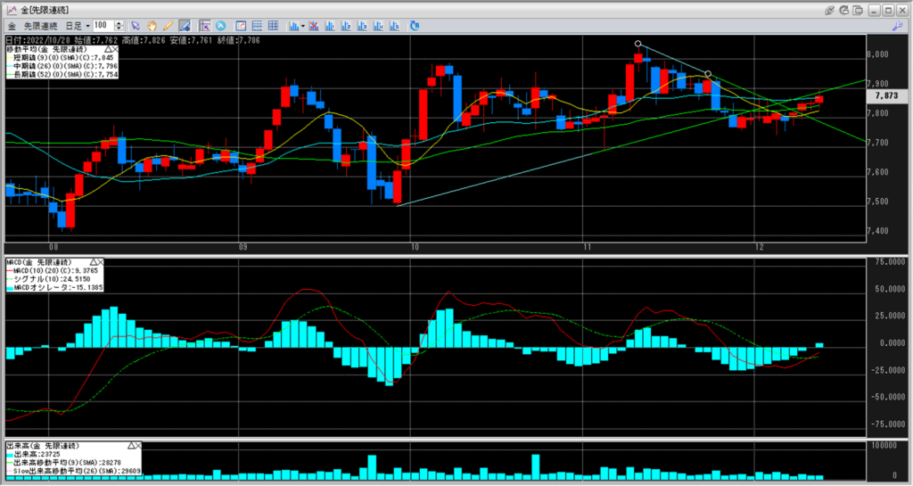 このまま金価格が上昇し、下値を結んだラインを超え、7,900円を試しに行くのか。