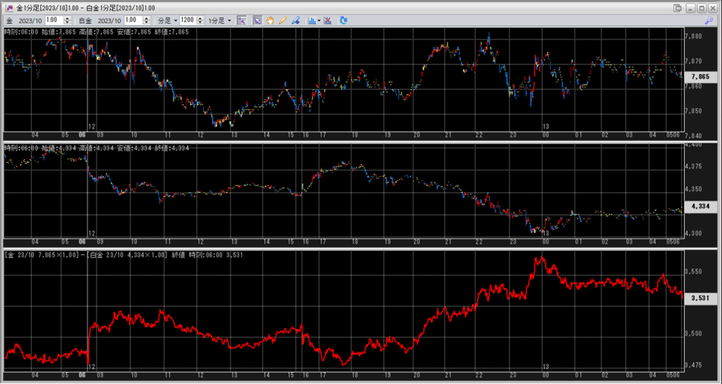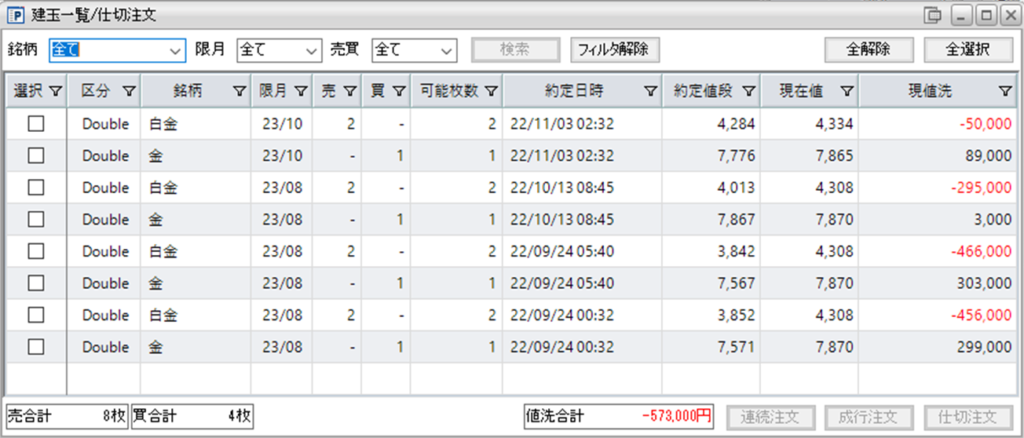 現在、鞘拡大の仕掛け金買い1枚-白金売り2枚の4組を保持しています。