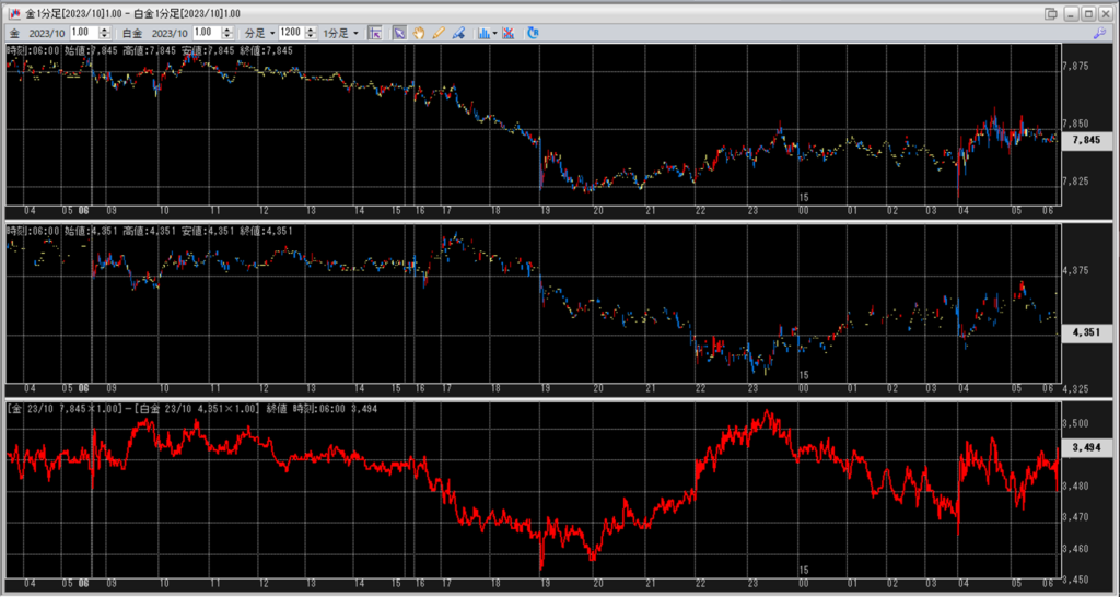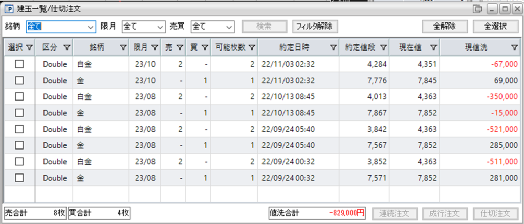 現在、鞘拡大の仕掛け金買い1枚-白金売り2枚の4組を保持しています。