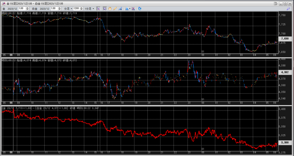 建玉としましては、鞘拡大の仕掛け金買い1枚-白金売り2枚を4組と