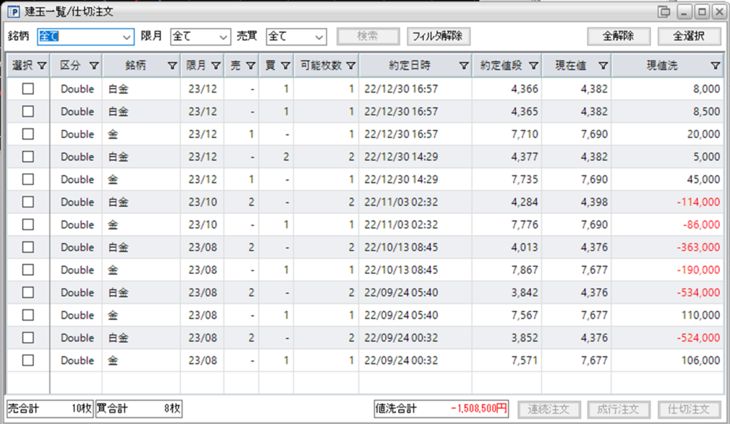 現在、鞘拡大の仕掛金買い1枚-白金売り2枚を4組と