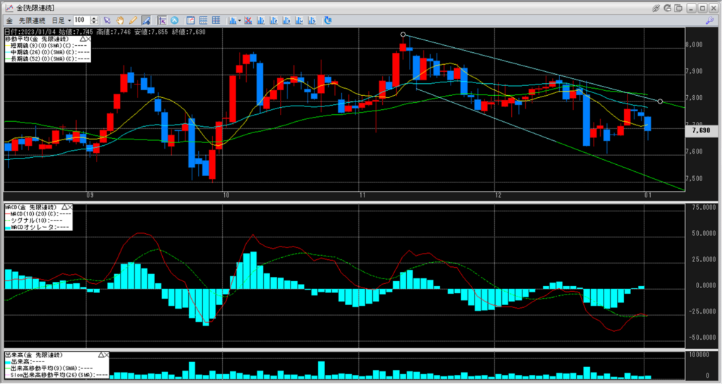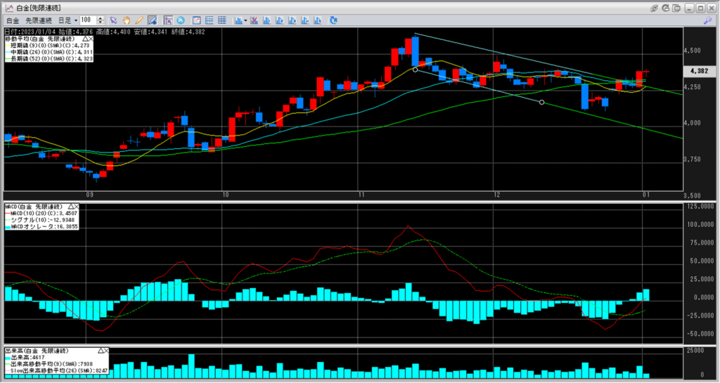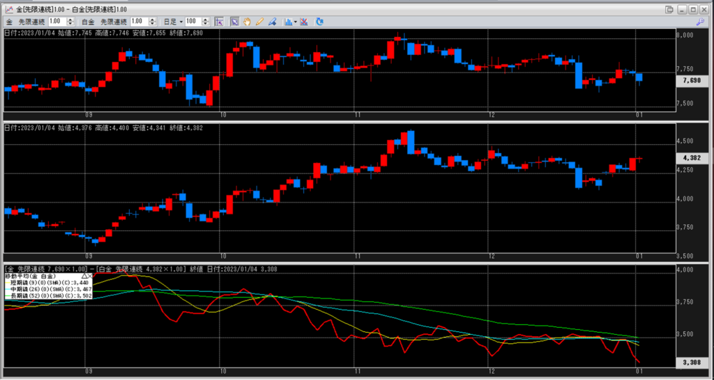 下記に金白金鞘の移動平均線のチャートを貼り付けています。