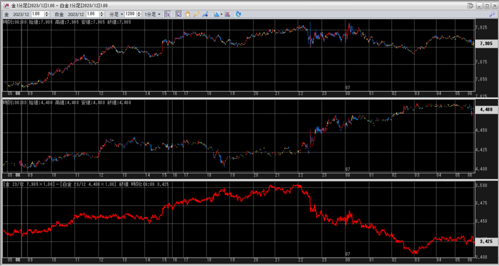 建玉としましては、鞘拡大の仕掛け金買い1枚-白金売り2枚を3組、