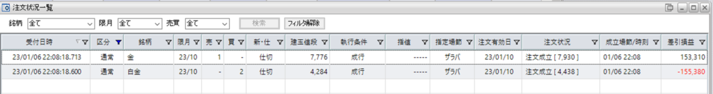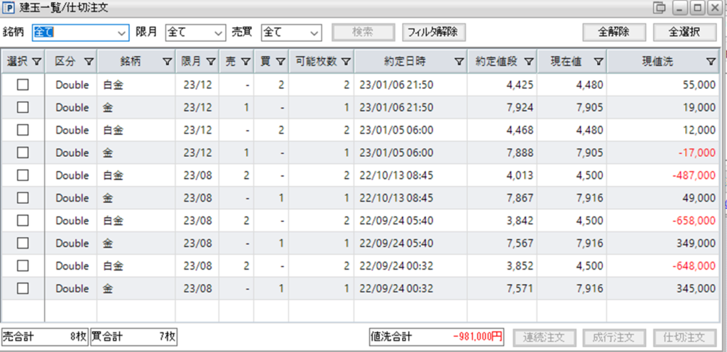 ということで、鞘拡大の仕掛金買い1枚-白金売り2枚を1組を手仕舞いし、