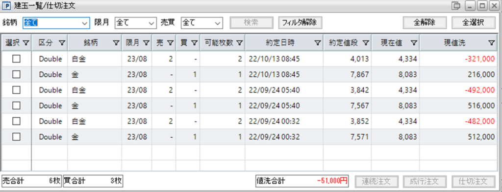 現在、鞘拡大の仕掛金買い1枚-白金売り2枚を3組を保持しています。