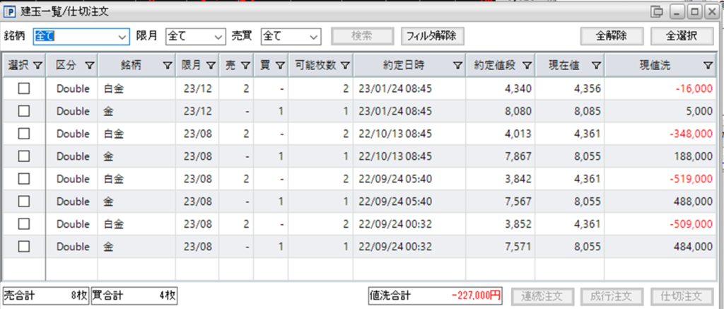 現在、鞘拡大の仕掛け金買い1枚-白金売り2枚の4組を保持しています。