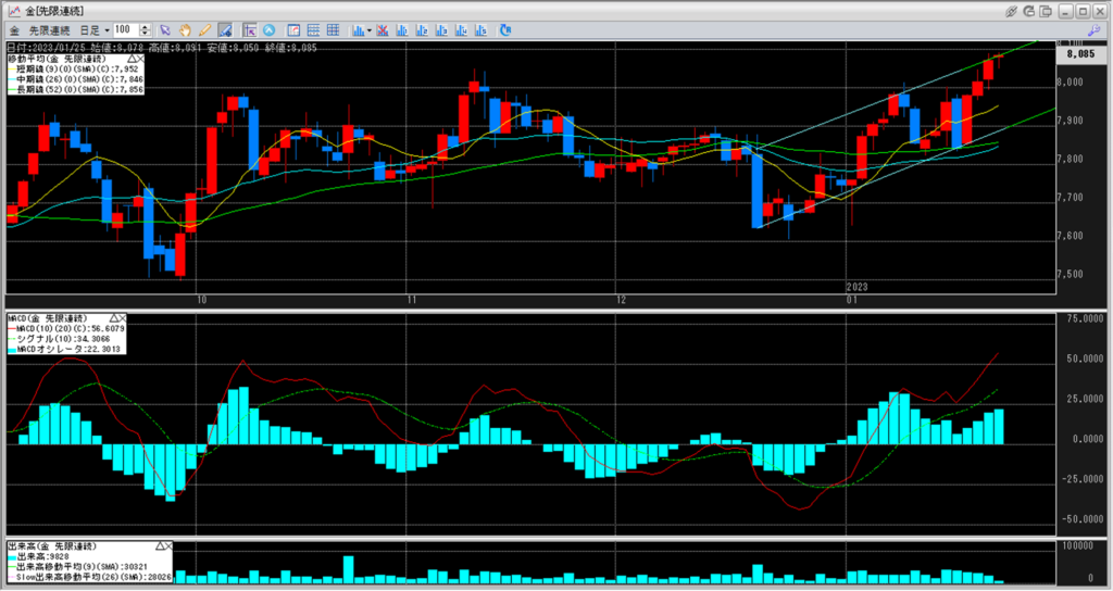 金のチャートをみると、8,000円と短期線を超え続けています。