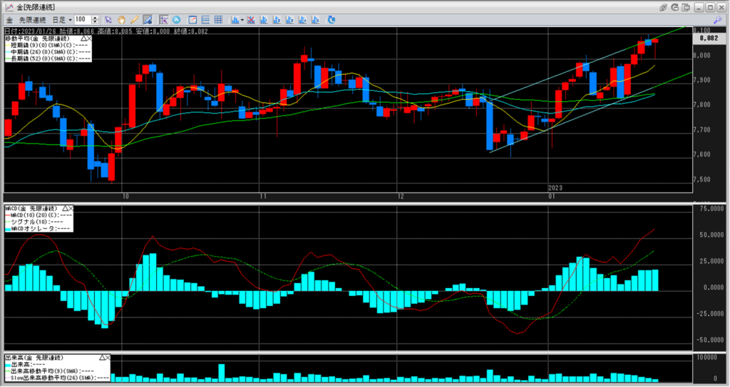 金のチャートをみると、8,000円と短期線を超え続けています。