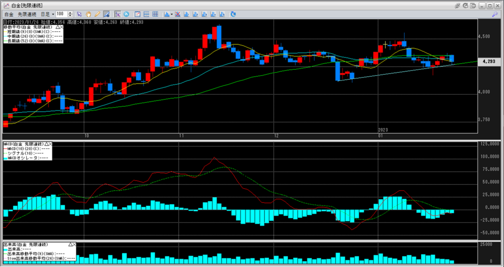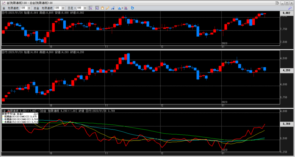 下記に金白金鞘の移動平均線のチャートを貼り付けています。