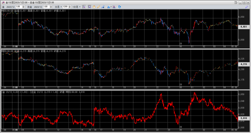 建玉としましては、鞘拡大の仕掛け金買い1枚-白金売り2枚を4組を保持しています。