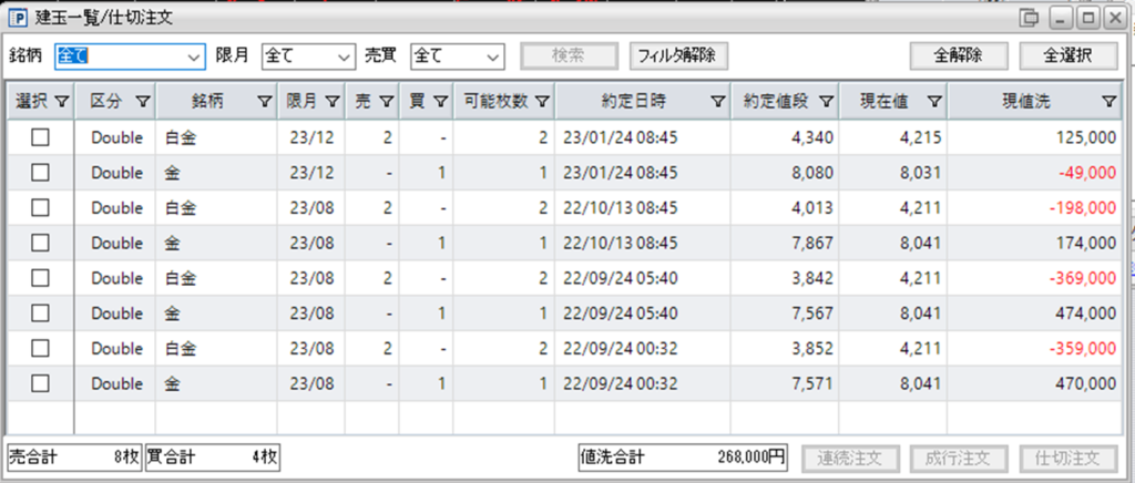 現在、鞘拡大の仕掛け金買い1枚-白金売り2枚の4組を保持しています。