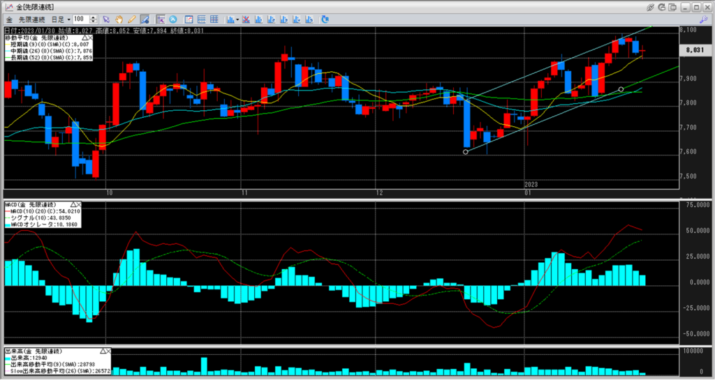 金のチャートをみると、8,000円と短期線を超え続けています。